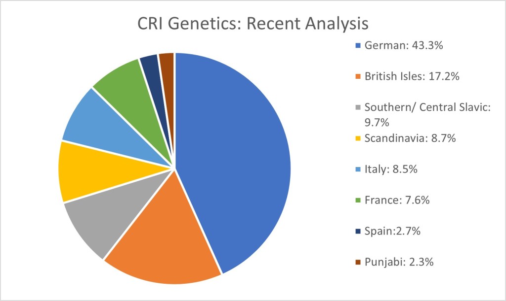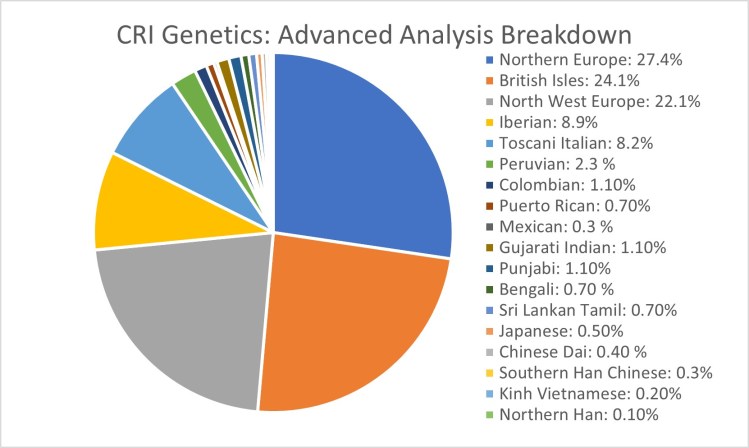Upon observing the different tests, it appeared that Ancestry only tested for the most recent ancestral lineages (Mine were: 32% Scotland, 23% England/Northwestern Europe, 18% Ireland, 17% Sweden/Denmark, 5% Germanic Europe, 4% Eastern Europe/Russia, and 1% Finland). However, MyHeritage and CRI genetics went deeper and explored older ancestors. From MyHeritage, I found that I had higher percentages of Scandinavian, Western European, and even some Iberian, Greek, and Ashkenazi Jewish. These results, I have compiled into different pie charts to help visualize the percentages better. While I didn’t take a CRI Genetics test, I am using my mom’s results. They conducted a recent analysis, which looks at five generations of her ancestors. The advanced analysis looked even further back. It went thousands of years well beyond the last five generations and looks at some of the oldest ancestors in the family history. This advanced ancestry broke her results into European, AdMixed American, South Asian, and East Asian. These four categories were broken further into smaller segments which is shown in the graph below. It was the most fascinating thing to find out because while the percentages were relatively low, perhaps it was these phenotypic traits that were expressed in my mother, brother, and me.